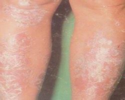 牛皮癣初期症状开始为粟粒大至黄豆大的红色点疹,随着病情的发展,点疹会逐渐扩大增多,甚至互相融合成片,底部浸润明显,边缘清楚,周围有炎症红晕,呈点滴状、钱币状、地图状、盘状、蛎壳状等。