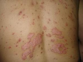 界限清楚的点疹:牛皮癣初期症状开始为粟粒大至黄豆大的红色点疹,随着病情的发展,点疹会逐渐扩大增多,甚至互相融合成片,底部浸润明显,边缘清楚,周围有炎症红晕,呈点滴状钱币状地图状盘状蛎壳状等。